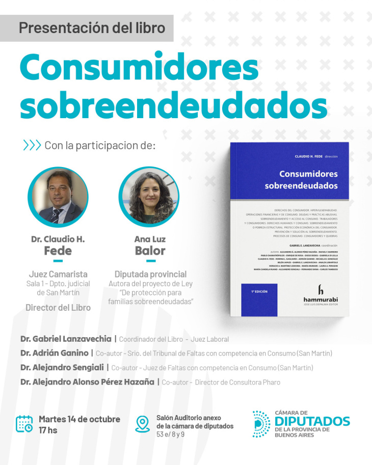 Además, participarán del panel los coautores del libro: el Dr. Gabriel Lanzavecchia, juez laboral y coordinador de la obra; el Dr. Adrián Ganino, secretario del Tribunal de Faltas con competencia en Consumo de San Martín; el Dr. Alejandro Sengiali, juez de Faltas con competencia en Consumo en el mismo distrito; y el Dr. Alejandro Alonso Pérez Hazaña, director de la consultora Pharo.