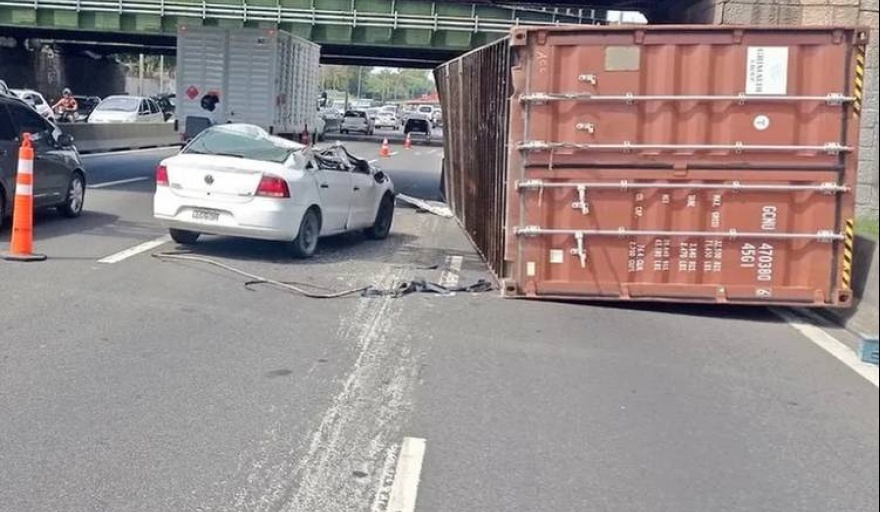 El impacto provoco el desprendimiento del contenedor que cayó sobre la parte lateral del techo de un automóvil Volkswagen Voyage que pasaba a su lado por ese lugar.