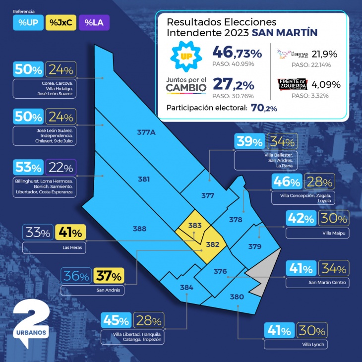 Unión por la Patria fue la fuerza más votada en San Martín en todas las categorías. En lo municipal, el intendente Fernando Moreira logró aumentar el caudal de votos respecto a las PASO y Juntos por el Cambio sacó menos votos. El espacio libertario tuvo un leve crecimiento, pero sufrió el corte de boleta en contra respecto al tramo que llevaba a Javier Milei, quien salió segundo y relegó al tercer lugar a Patricia Bullrich.