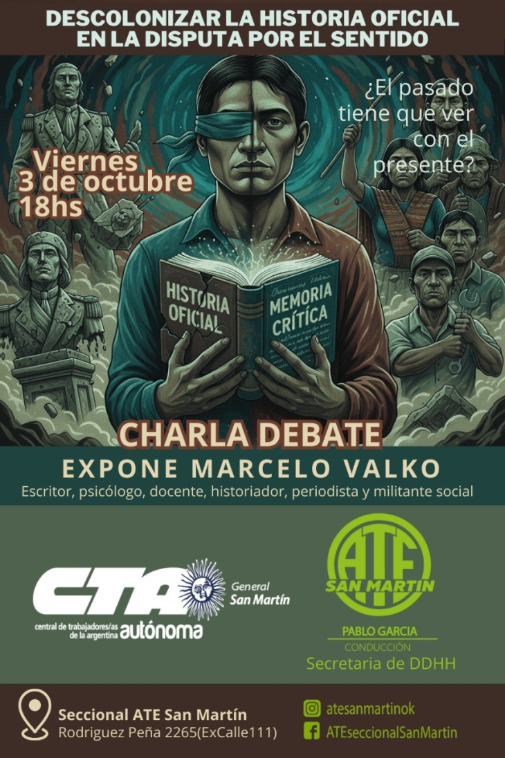 La charla “Descolonizar la historia oficial en la disputa por el sentido” comenzara a las 18 en la casa de los Estatales de San Martín que queda en Rodríguez Peña 2265 (Ex Calle 111) y es abierta para toda la comunidad.