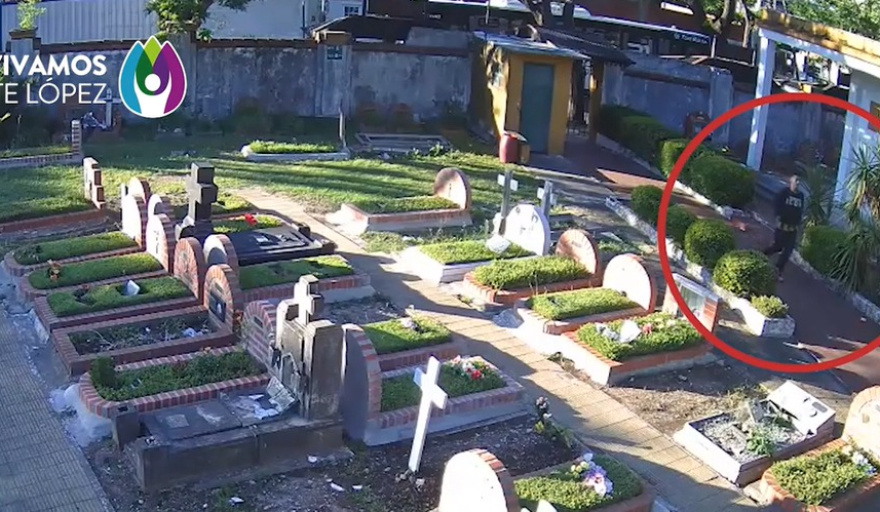 A partir de esta primera alerta, los agentes de monitoreo de ESCUDO informan la descripción de este “saqueador de tumbas”, tratandose de un hombre de contextura delgada, vestido de negro y con una remera amarilla abajo, que hurtaba una chapa sustraída de una lápida.