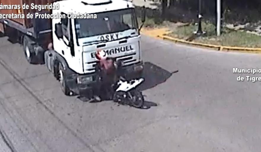 En Don Torcuato, las cámaras del Centro de Operaciones Tigre (COT) registraron un fuerte siniestro vial entre una moto y un camión: la motociclista fue trasladada al hospital de manera inmediata.