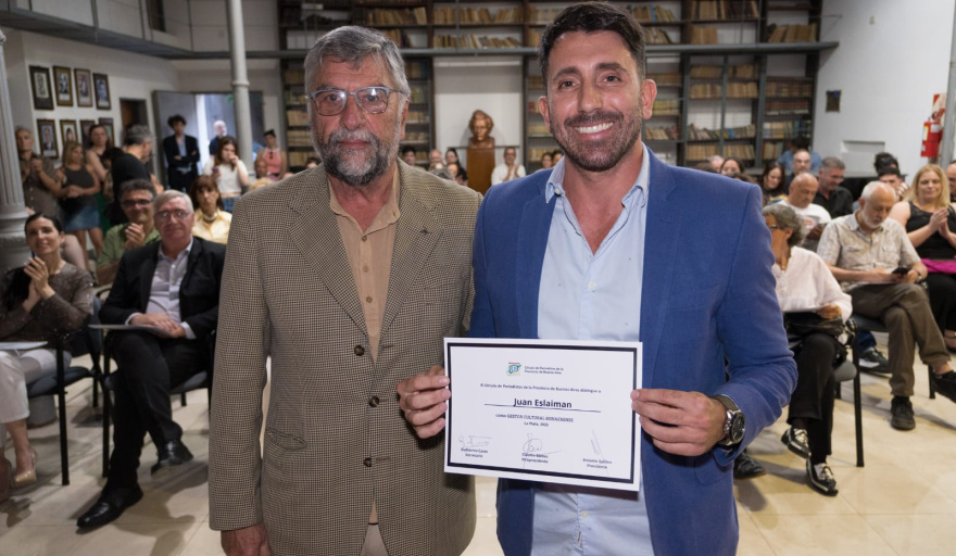 La distinción le fue entregada este sábado en la sede del Círculo de Periodistas de la Provincia de Buenos Aires, en la ciudad de La Plata, y desde la institución destacaron la labor de Juan Eslaiman haciendo foco en el impulso que le dio a la creación de la Fundación La Usina, entidad que promueve la formación educativa y profesional, y al respaldo que le brindó al desarrollo de CREARTE, una innovadora y poderosa PLATAFORMA CULTURAL INTERACTIVA destinada a promocionar, comercializar y divulgar obras artísticas de talentos del Partido de San Martín. Además, pusieron de relieve la reciente realización del Primer Festival de Cine de Villa Lynch, que fue promovido por Juan Eslaiman.