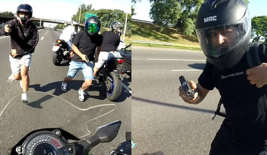 Los delincuentes lo cercaron con varias motos, lo obligaron a detenerse y, bajo amenaza de armas, le robaron la moto. Todo quedó registrado por una cámara instalada en el casco de la víctima.