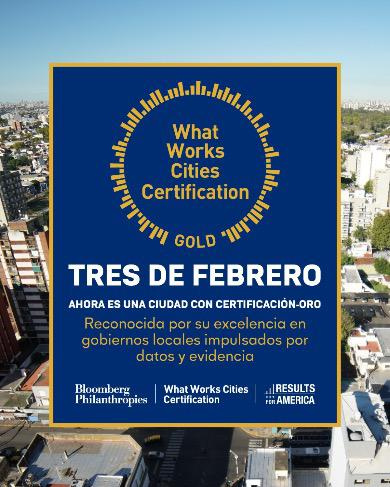 Results for America ha otorgado la Certificación What Works Cities de Bloomberg Philanthropies al municipio de Tres de Febrero por el uso de datos de forma excepcional para informar políticas, asignar fondos, mejorar servicios, evaluar programas e involucrar a los residentes. El estándar de la certificación What Works Cities refleja las prácticas, políticas e infraestructura que los municipios necesitan tener para aprovechar al máximo los datos en la toma de decisiones.