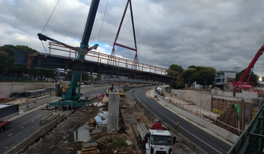 Durante este fin de semana, también se avanzó con el montaje de un nuevo puente ferroviario para el tren Belgrano Sur, sobre la colectora norte de la autopista, con el objetivo de generar la estructura necesaria para que se pueda excavar por debajo un paso que permita darles continuidad a los dos carriles de su traza. Esto requirió otro operativo similar al anterior con dos grúas pesadas para mover las dos losas que formarán el nuevo puente. Cada una de ellas mide 20 metros de largo x 6,20 metros de ancho y un peso de 110 toneladas cada una.